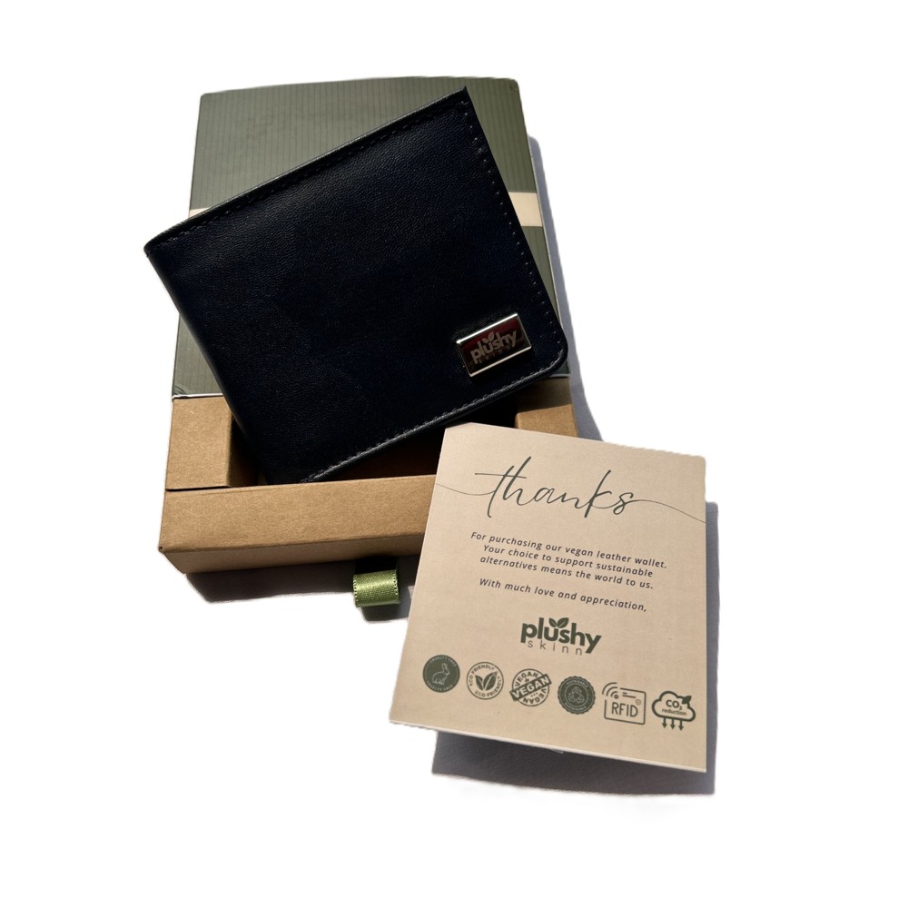 A wallet designed for carrying more without carrying more bulk. In Noir, the plant-based leather alternative holds its structure through daily use — engineered for Indian heat, humidity, and the kind of handling that shows, over time, whether a material was chosen carefully or conveniently. The fold spine is reinforced; the edge finishing is structured to retain its form across repeated opening and closing. A subtle silver Plushy Skinn insignia sits on the exterior — present, not decorative. Eight card slots and a cash compartment. For the desk, the coat pocket, the bag you reach into without thinking.